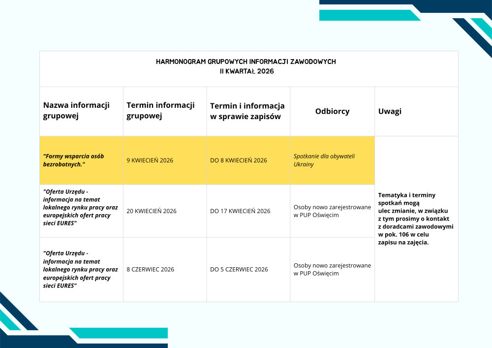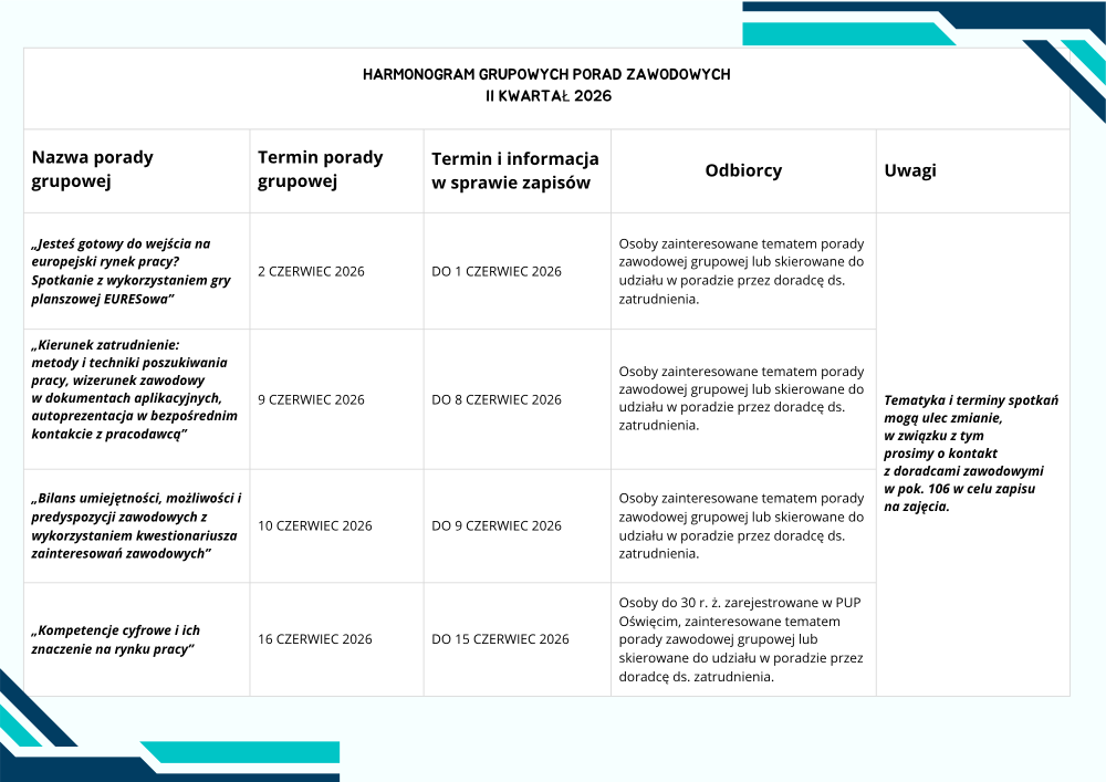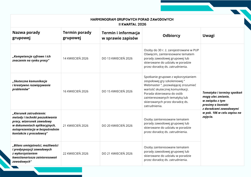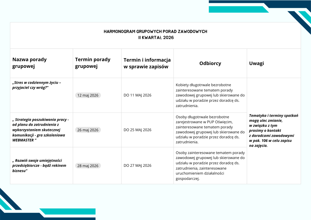 Zapraszamy do zapoznania się z harmonogramem porad grupowych organizowanych przez Powiatowy Urząd Pracy.